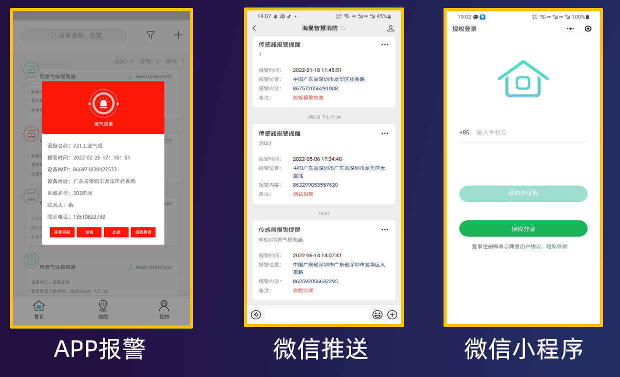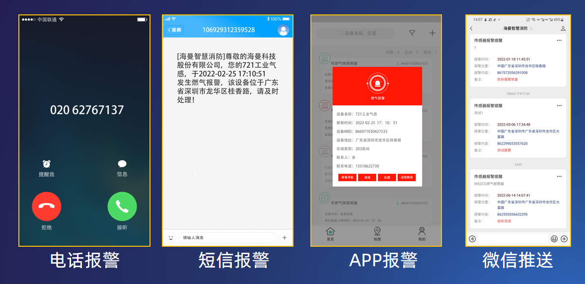 設備監(jiān)測到氣體泄露后,會同時通過平臺彈窗、平臺警報聲、電話、短信、APP報警、微信推送方式通知用戶,而且電話可以同時分享給多人,把報警信息通知給安全負責人以及用戶端。