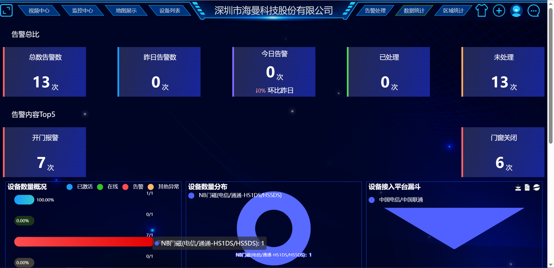 平臺的首頁展示包含監(jiān)測設備的總數(shù)、故障數(shù)統(tǒng)計、設備在線數(shù)統(tǒng)計、報警曲線圖、報警時段統(tǒng)計、最新報警信息等。